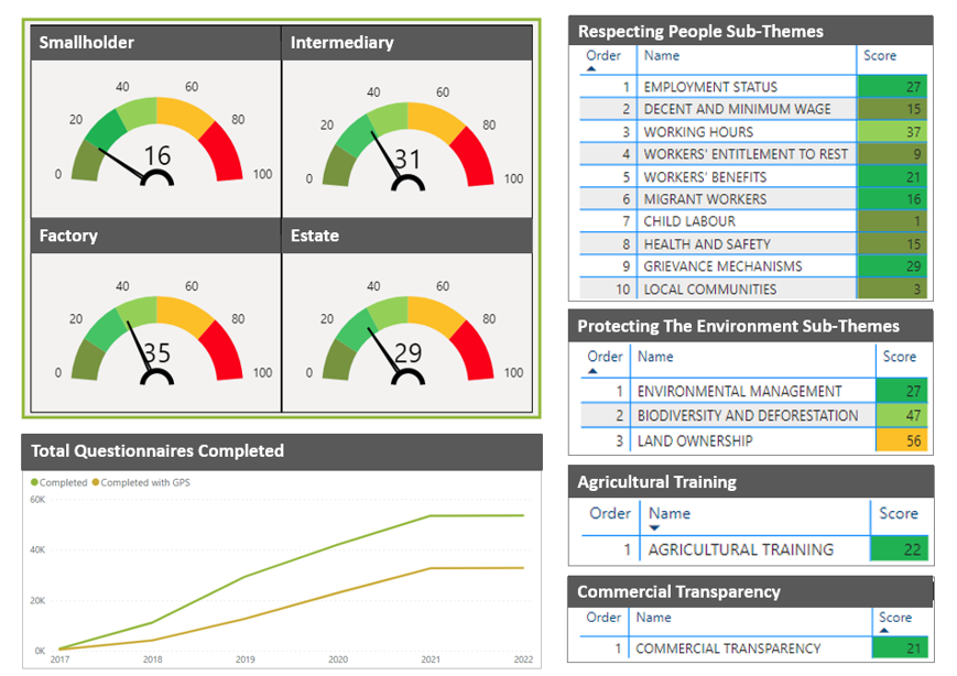 From the questionnaires, data points are then aggregated onto your personal web-based dashboard, that allows the visualization of the risks per sustainability topic: social, environment, agricultural training, and commercial transparency. The risk level calculated for each answer to a question can also be visualized.